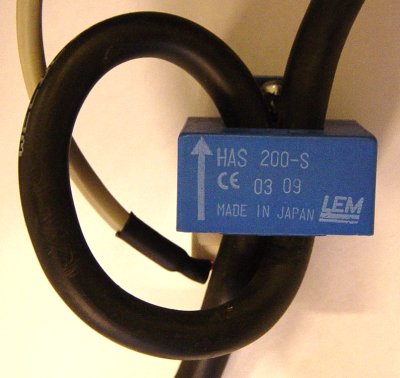 Capteur LEM HAS 200-S vue de dessus avec 2 cables de 25mm²